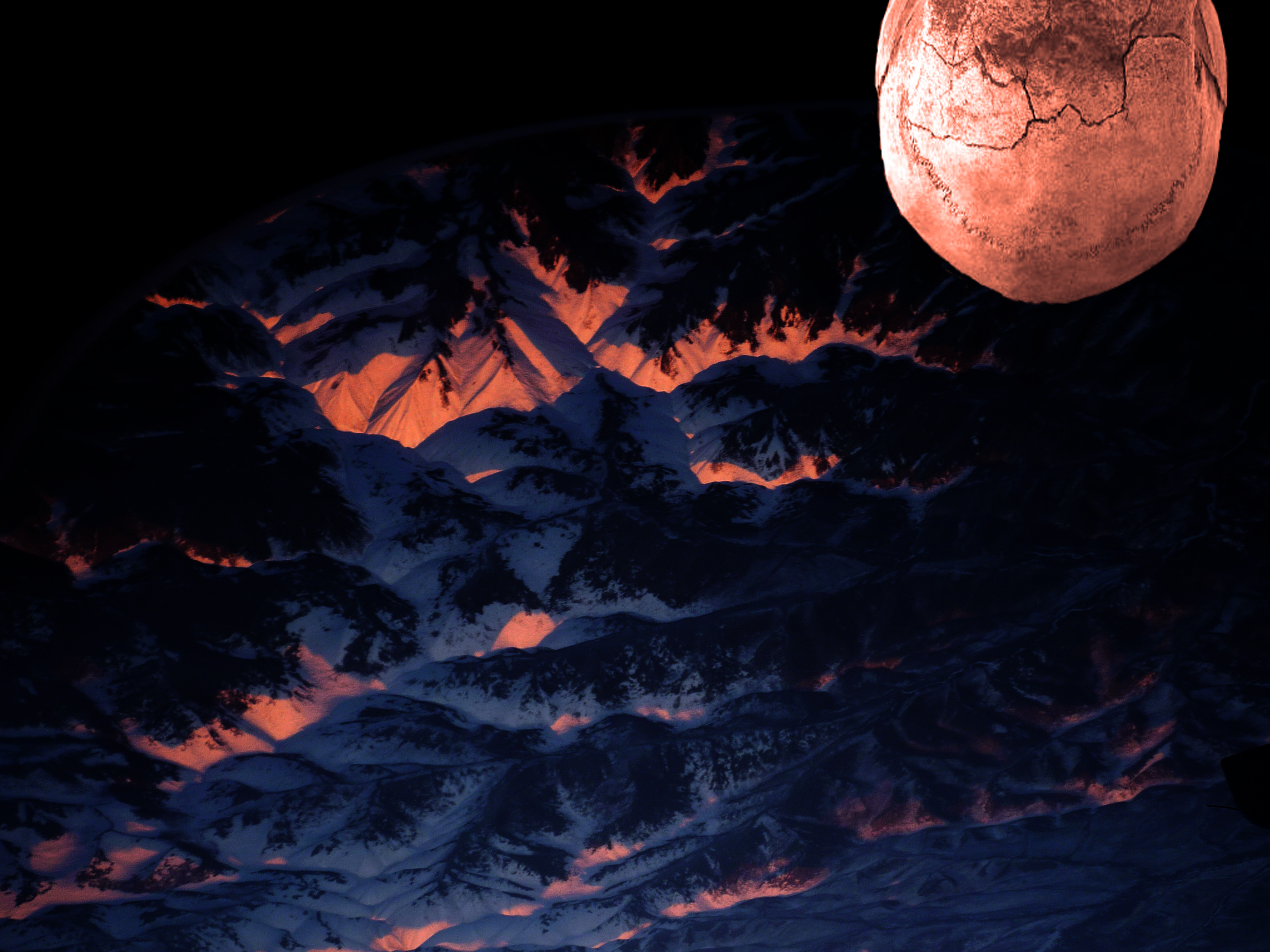Without the landscape his skull is bare. The man who falls into the moon can only live outside his own consciousness. As soon as he lands he irrevocably changes what he loves, and he sees his beloved nature disappear under his hands. The light of the sun is too bright. But not now yet – he just keeps falling. Because once he has landed and woken up everything will be forgotten. What remains is an unfulfillable longing. Only when he will never wake up he will be one.